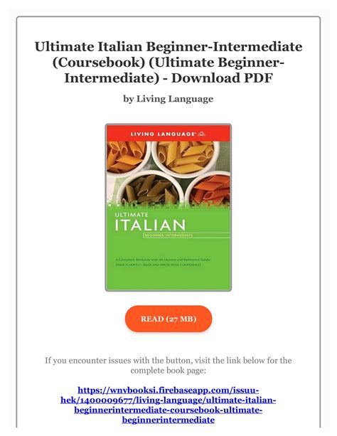 Download ultimate italian beginner intermediate PDF online is a convenient and frugal way to read ultimate italian beginner intermediate you love right from the comfort of your own home. Yes, there sites where you can get PDF "for free" but the ones listed below are clean from viruses and completely legal to use.